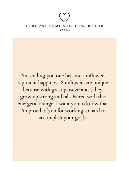 Show someone your congratulations by gifting them with this beautifully designed and printed orange sunflower card. The sunflower is a symbol of happiness as it stems from its namesake, the sun itself. Sunflowers are unique in that they rise towards the heavens and become taller than any other flower (and even people) around them. Their perseverance, pride and vibrant disposition is the perfect anecdote for victory. This card would make the perfect gift for someone who has risen above all odds to become victorious in their endeavours. Show them that you wish for their continued success by gifting them with this thoughtful card.