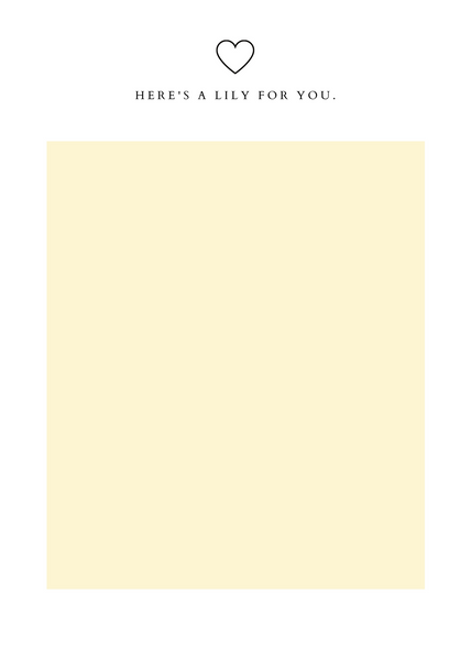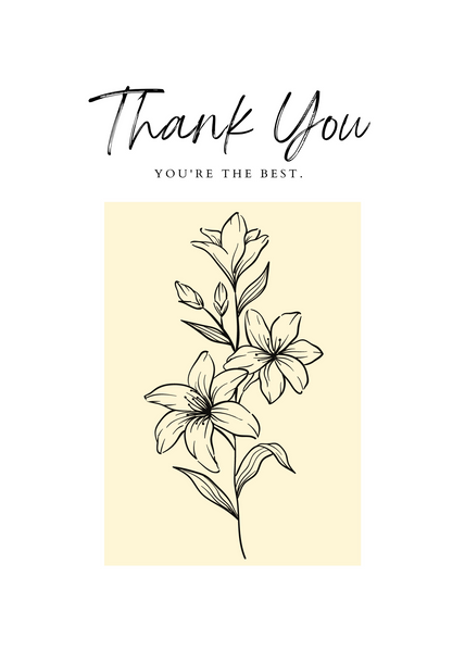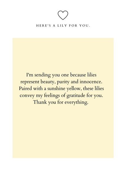 Show your friend that you are thankful for them with the beautifully designed and printed yellow lily card. The lily motif is universally recognized as a symbol for beauty, purity and innocence. Paired with a sunshine yellow, lilies take on a more vibrant feeling and represent feelings of happiness. Thus, this combination is perfect for anyone who wants to sincerely express their gratitude for a loved one.